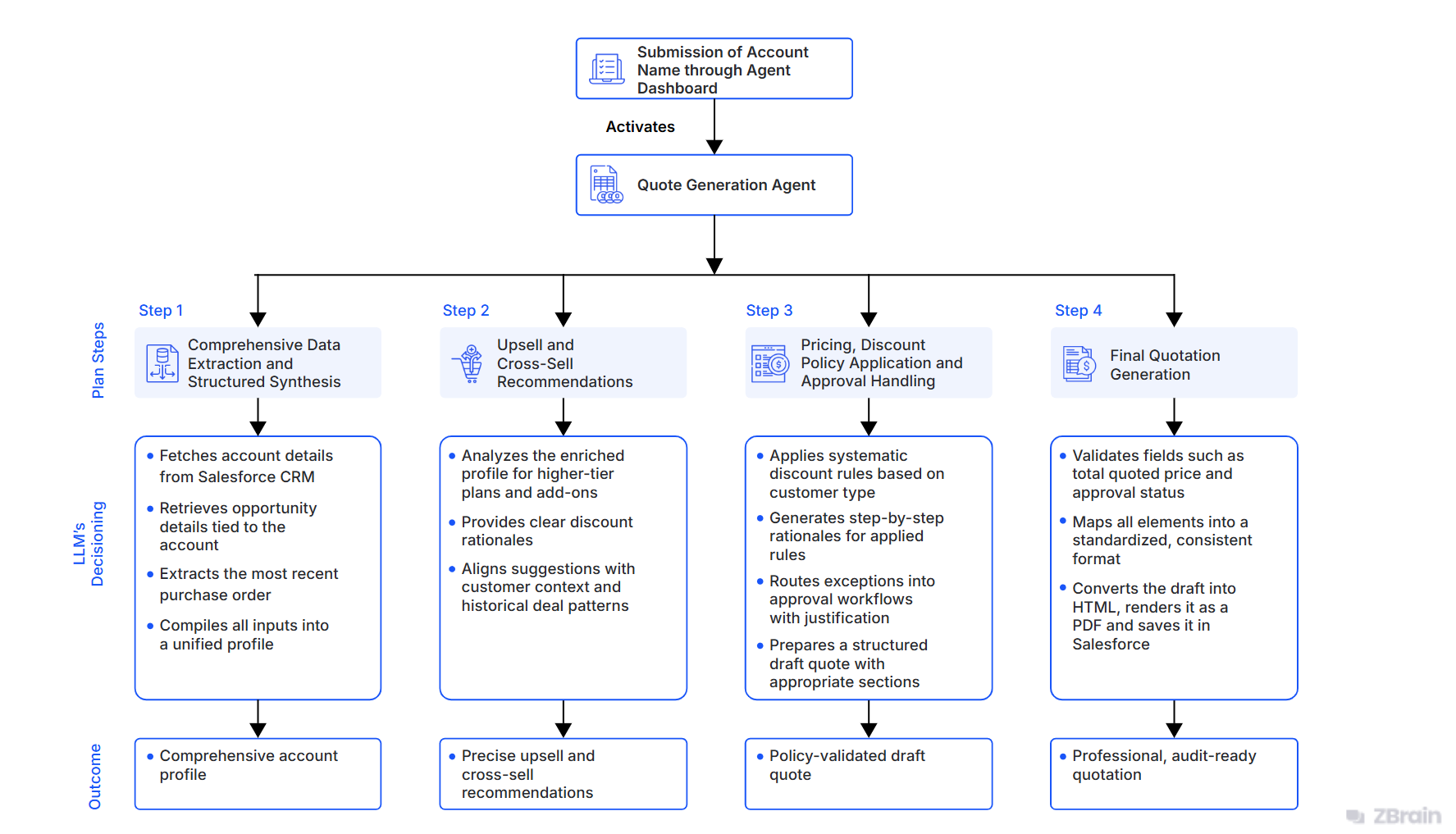 ZBrain quote generation agent automates the end-to-end workflow of creating accurate, compliant and customer-ready sales quotations. It combines Salesforce CRM data, purchase order details, knowledge base insights, pricing policies and LLM-driven reasoning to generate structured and professional quotes.