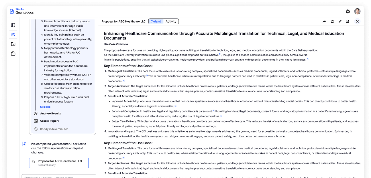 QuantaDoc provides an Activity view that offers end-to-end visibility into the document generation process. Users can track how deep research is being performed, view technical execution logs, and monitor progress in real time. This ensures full transparency into background research and document generation, allowing users to stay informed while the process runs seamlessly in the background.