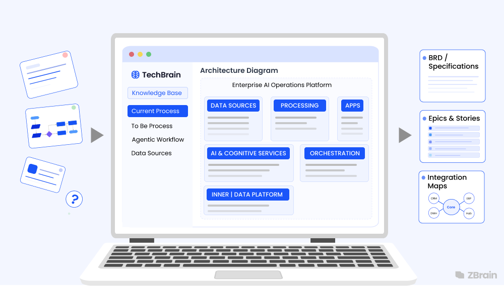 Getting started with TechBrain typically begins by identifying an upcoming enterprise initiative, such as a system integration, modernization program, workflow automation, or transformation effort, where architecture design is critical to delivery. TechBrain’s team works with your solution architects and technical leads to onboard the initiative into a governed workspace, consolidate existing requirements and technical context, and demonstrate how the platform supports the full design-to-artifact workflow. Organizations can request a walkthrough at Book a Demo – ZBrain to see how TechBrain fits within their existing architecture and delivery processes.